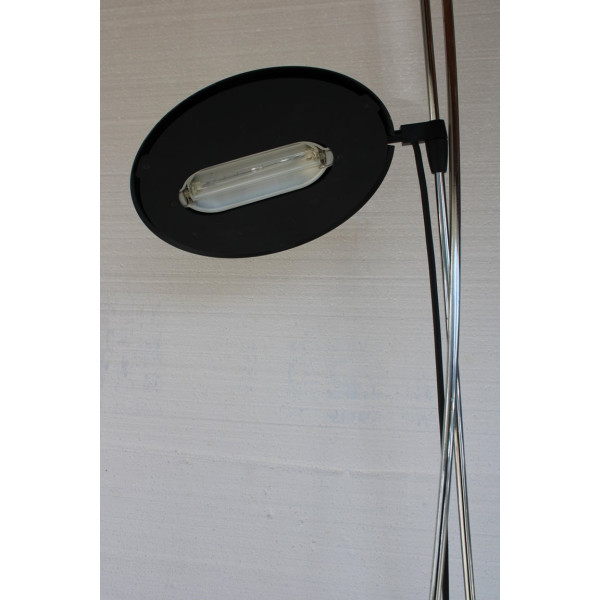 - Sculptural Italiana Luce floor lamp. One continuous chromed steel loop holds the lamp together and attaches to a raw, minimalist steel slab base. The chrome lamp loop also is slightly bent. Ive seen other examples of these lamps and the loop is exactly the same. Although the lamp looks very simple, much detail went into this design. The black dome can be adjusted. Floor on/off dimmer switch. Lamp measures 82" high. Base is approximately 11" deep and 11" wide.